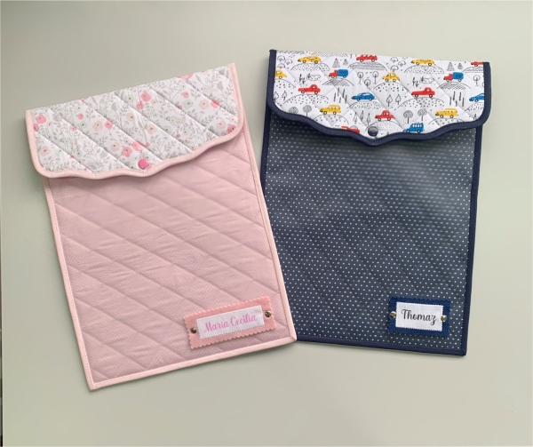 Ele é uma pastinha com o visor transparente para poder ter uma fácil visualização e fechamento com botão de pressão.